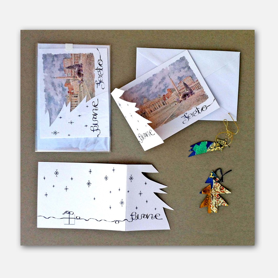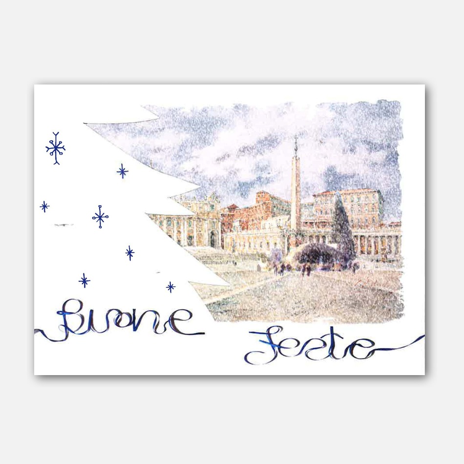 Biglietto di Natale con stampa di Piazza San Pietro (Roma), albero con fiocchi di neve