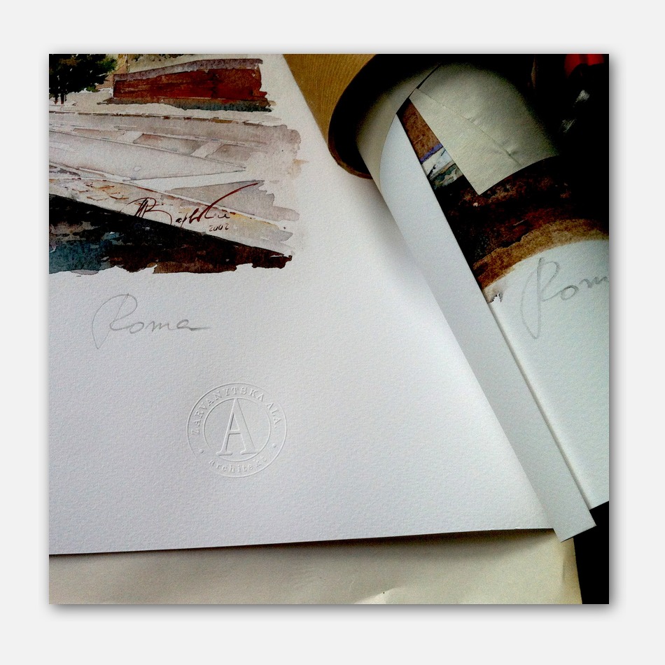 Stampato su carta somerset velvet, 340gr. Il disegno originale è scannerizzato ad alta definizione e poi stampato su carta di alta qualità, per una riproduzione quanto più simile all’originale.Ogni stampa è firmata e numerata dall’artista.Il prezzo ammonta a 35 euri più spedizione (Italia-9 euro, Europa-25 euro, Oltre Oceano 45 euro. Misure: 38x27cm. L’immagine ha un bordo di 10cm sulla base superiore e ai lati e uno di 12cm sulla base inferiore.Acquerello originale realizzato nel 2002 (venduto), 29x23cm.