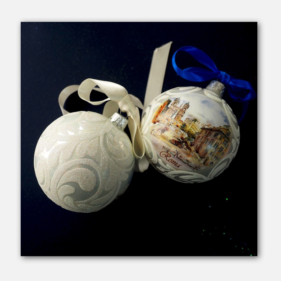 Decorazione natalizia in vetro con stampa di acquerello (veduta di Roma),80mm di diametro, materiale vetro, spedito in imballaggio di carta decorato. Il prezzo ammonta a 10 euro, con un ordine di 100 oggetti scende a 6,50 euro cadauno.